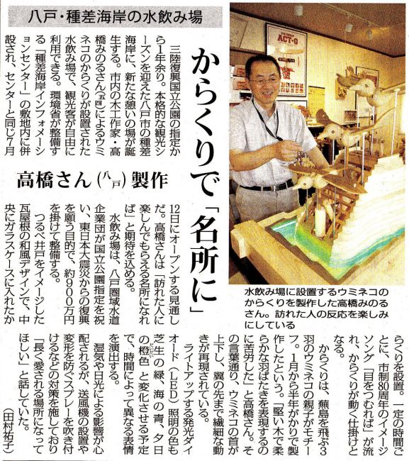 ウミネコからくり : 三陸復興国立公園 種差海岸(八戸市)のからくり時計。 蕪島(かぶしま)のウミネコをモチーフに、LED照明の変化とともに、桜田マコトさんの曲が流れ、毎正時動く。2014年