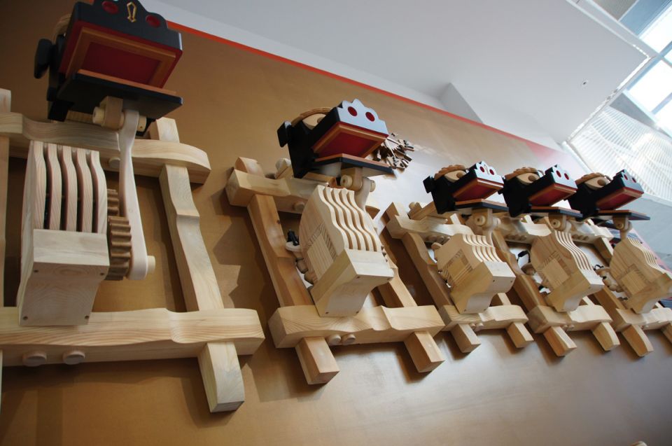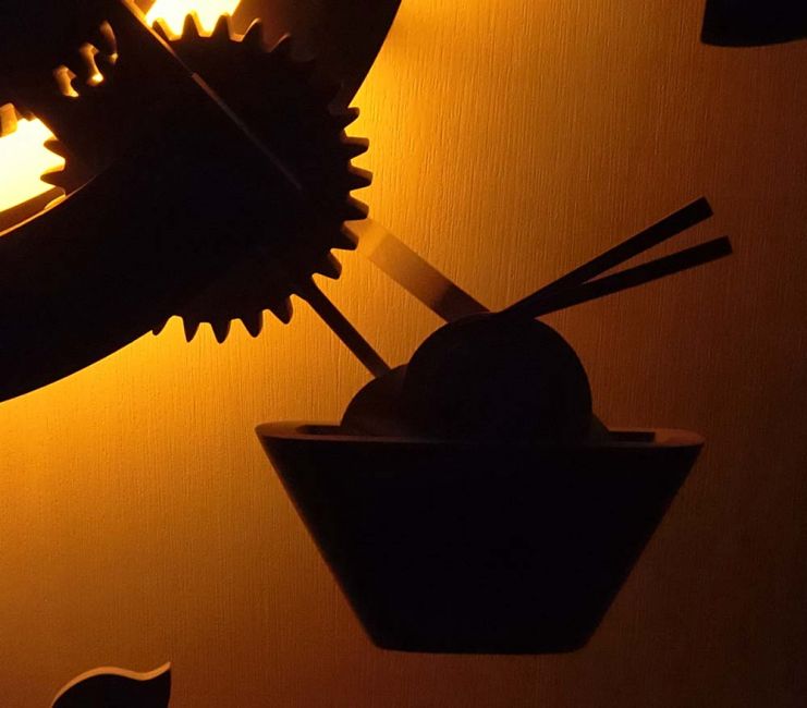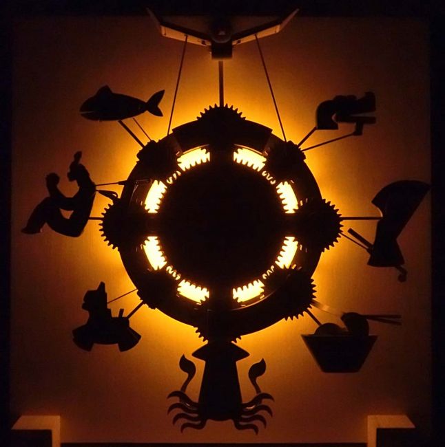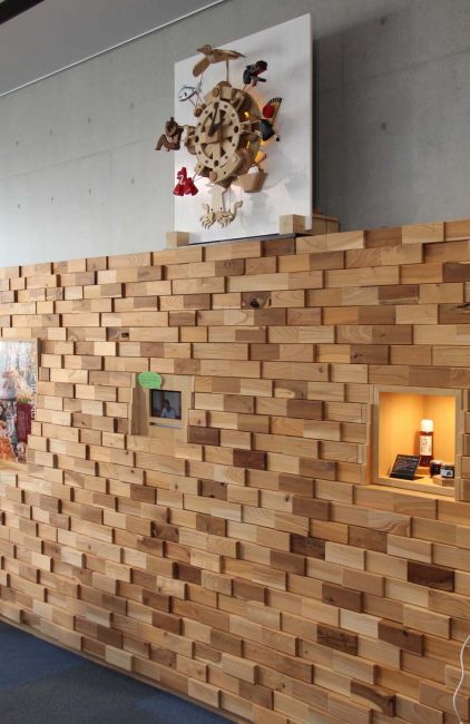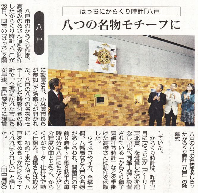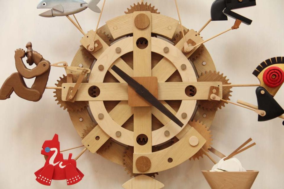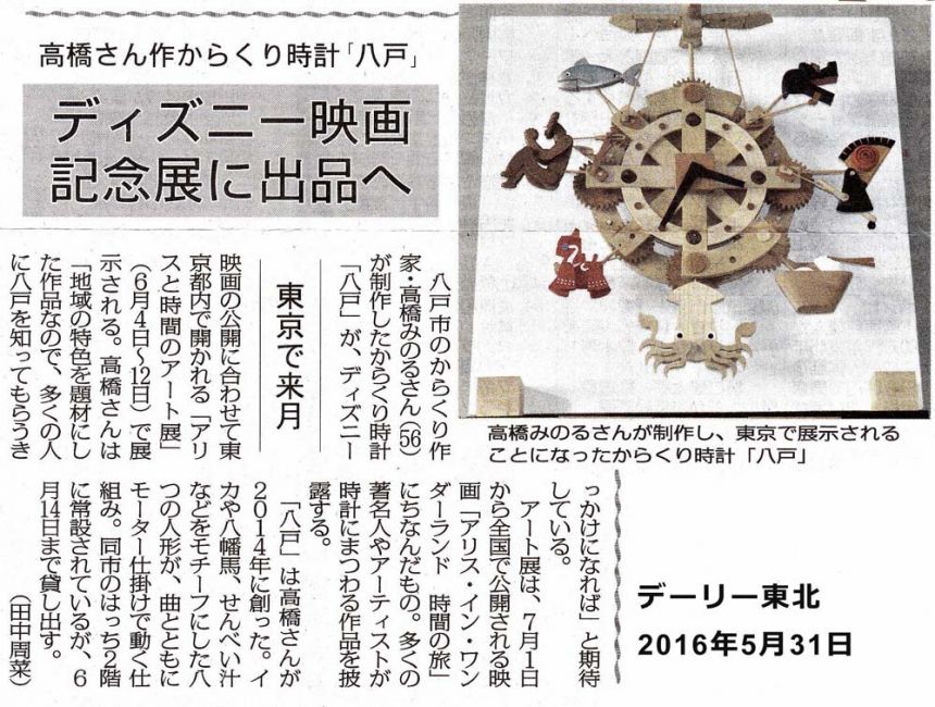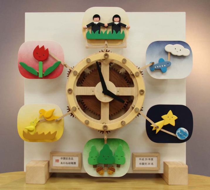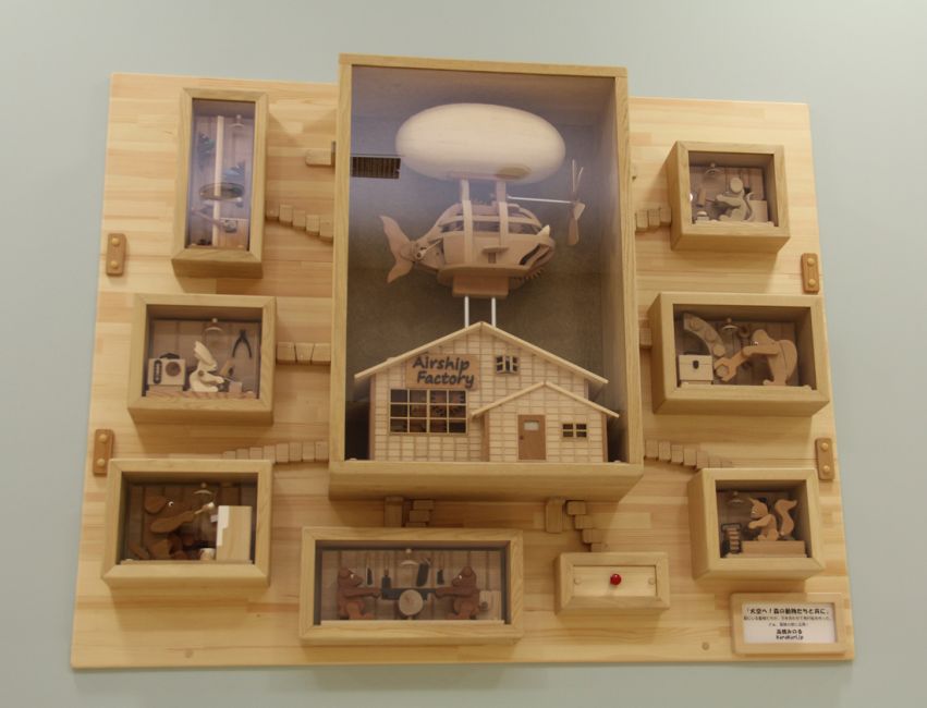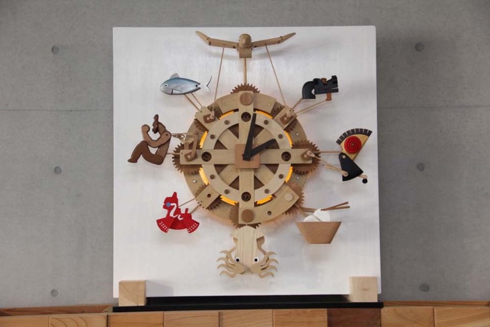 木のからくり時計「八戸」:八戸ポータルミュージアムはっちのからくり時計。2015年製作。八戸地方を代表する8つのアイテムが同時に動き、音楽が流れ、LED照明が点く。ディズニー映画イベント「アリスと時間のアート展」(汐留・日本テレビにて 2016年)招待参加。