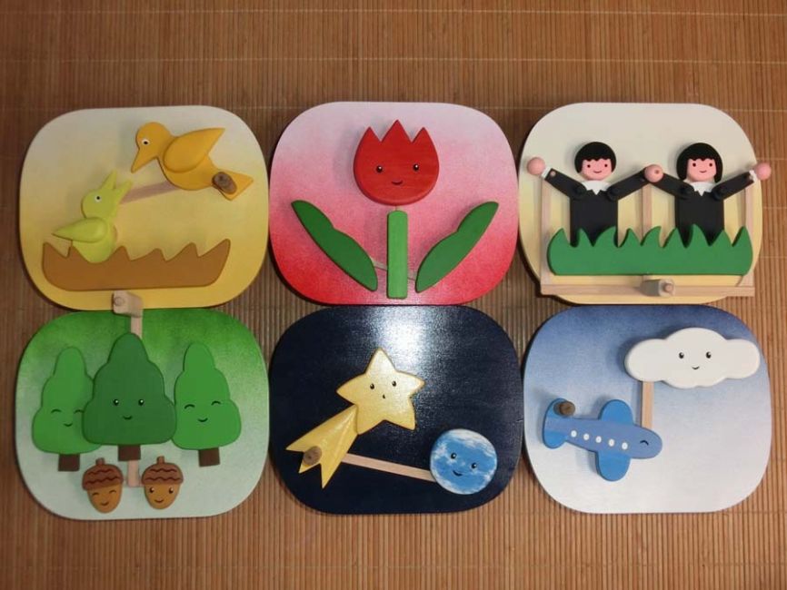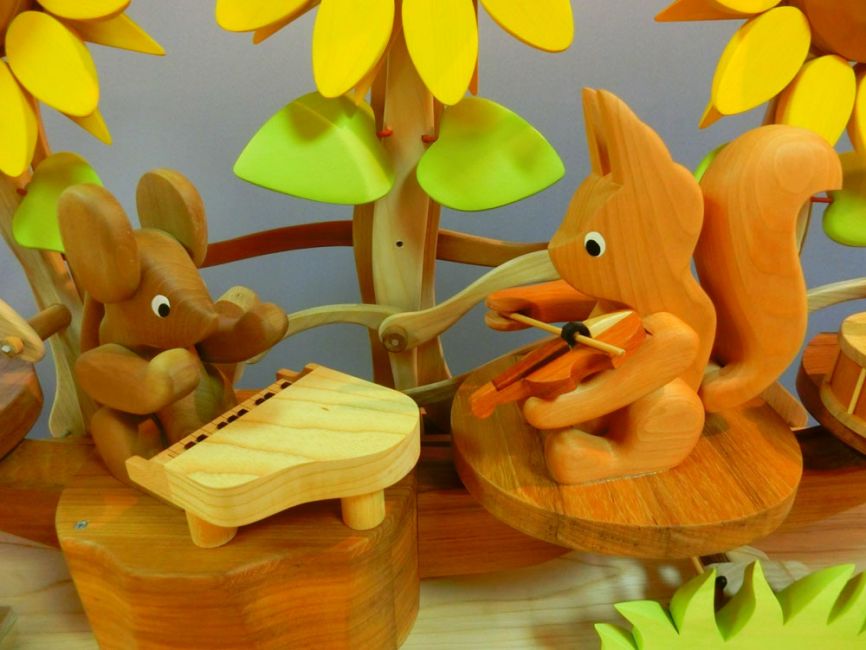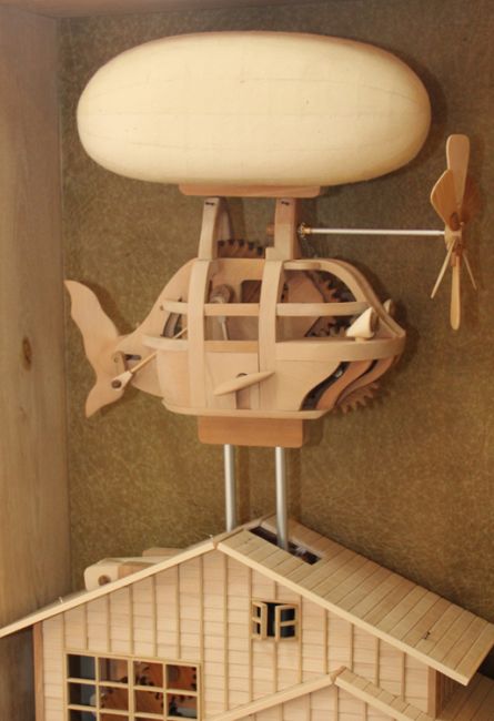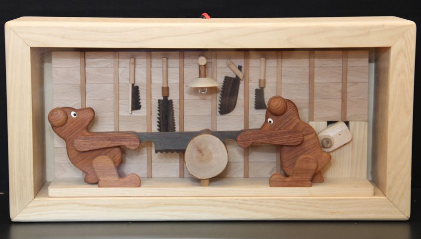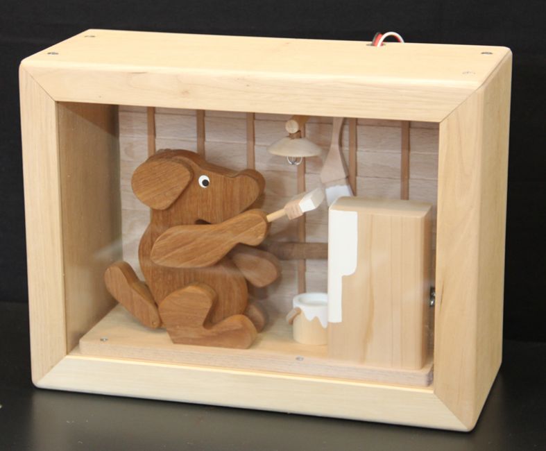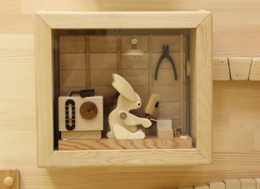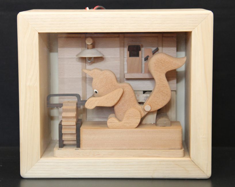 木のからくり時計「HOME 2016」:家の中で家族が共に暮らす様子を表現。時刻になれば鳥の声が流れ、八幡馬や動物が動く。プログラム制御で動くコンピューターからくり。【個人発注により、からくりの希望内容を聞きオーダーメイド制作。高さ70cm 2016年】