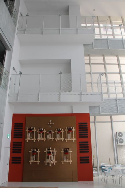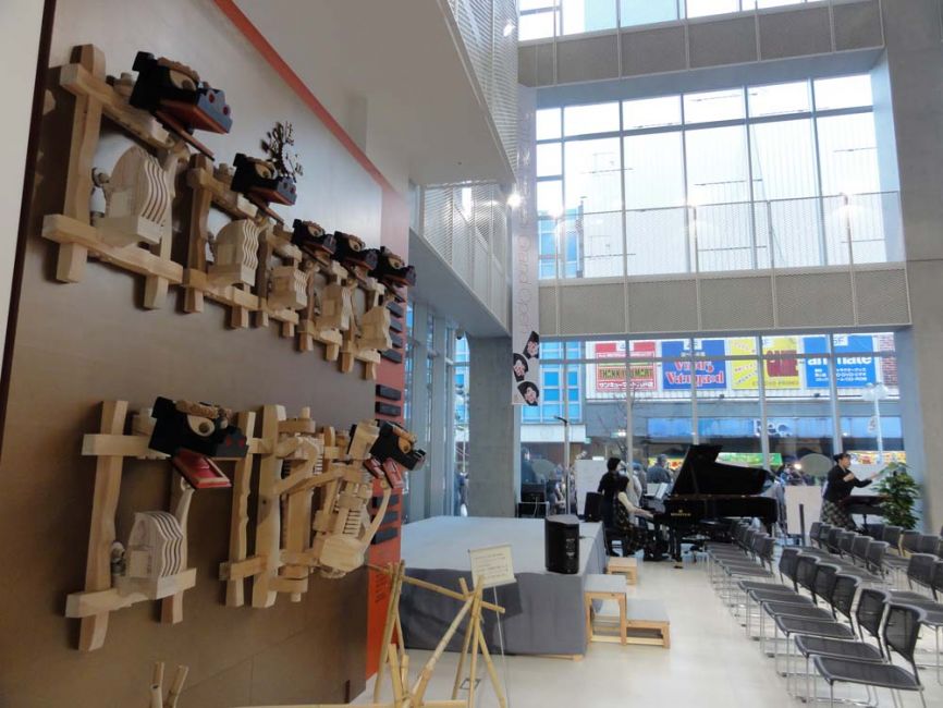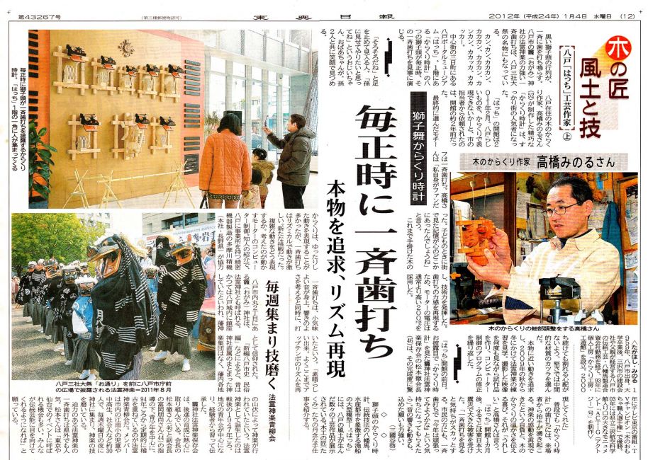 からくり獅子舞:八戸ポータルミュージアム・はっちエントランスのからくり時計。八戸市おがみ神社の法霊(ほうりょう)神楽を忠実に再現。毎正時に動く。2011年