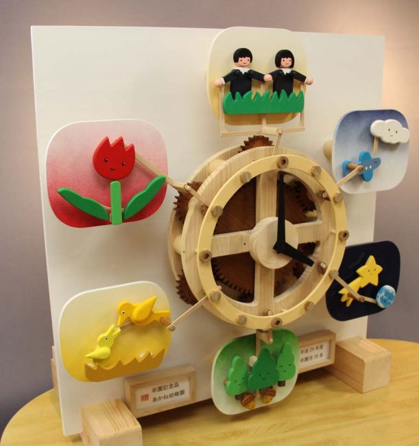 南部町・あかね幼稚園のからくり時計 : 時刻になれば園の歌が流れる。からくりの題材は、鳥、花、星など園歌の中から引用して動くようにしました。2018年製作。 YouTube動画アドレス→https://www.youtube.com/watch?v=KJMugfcehik