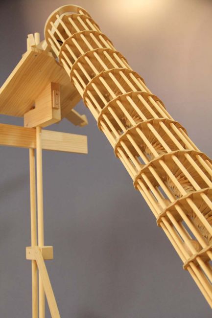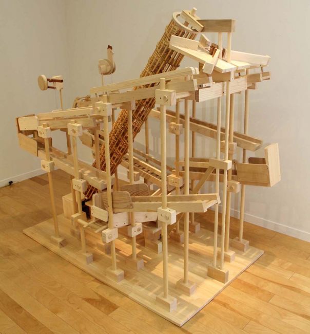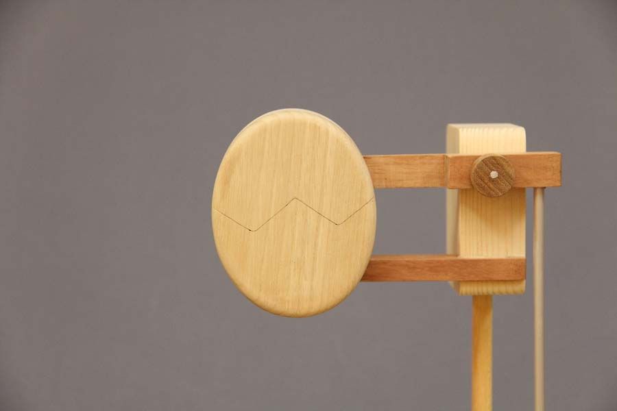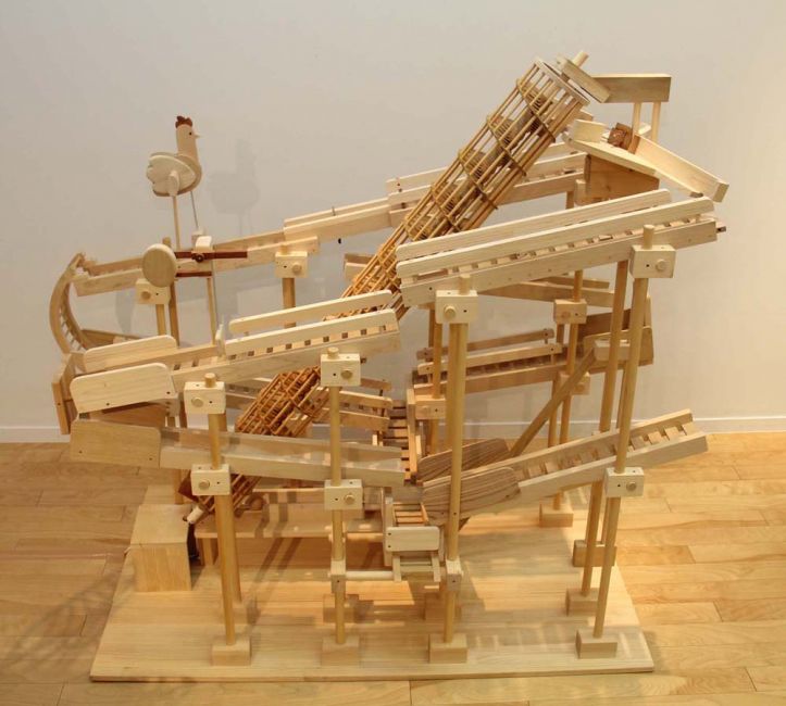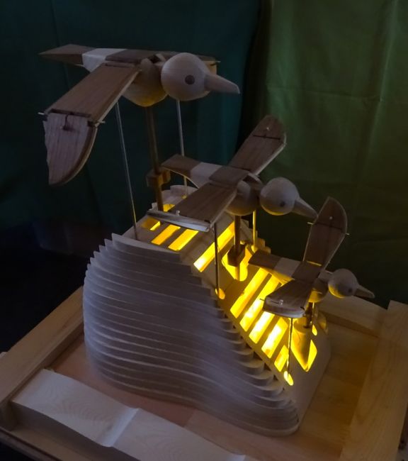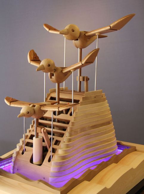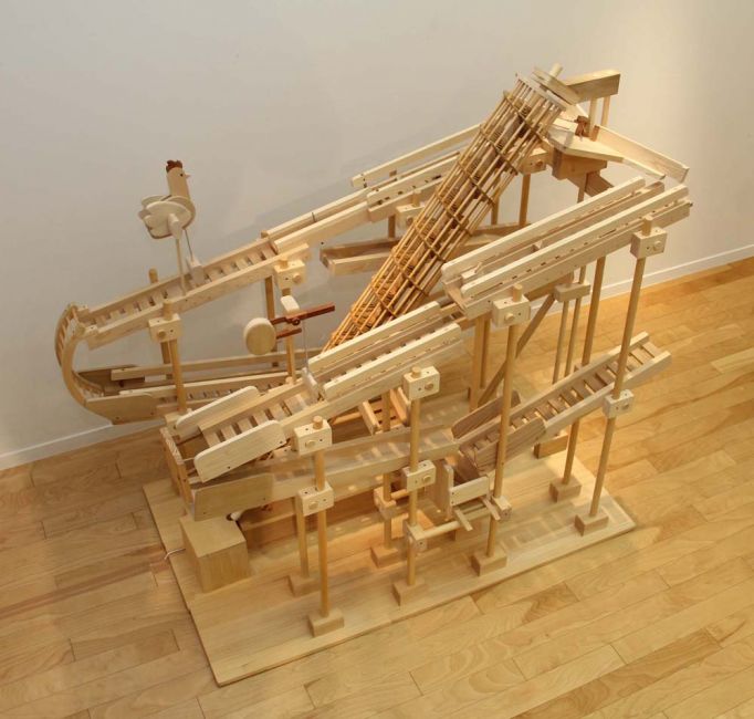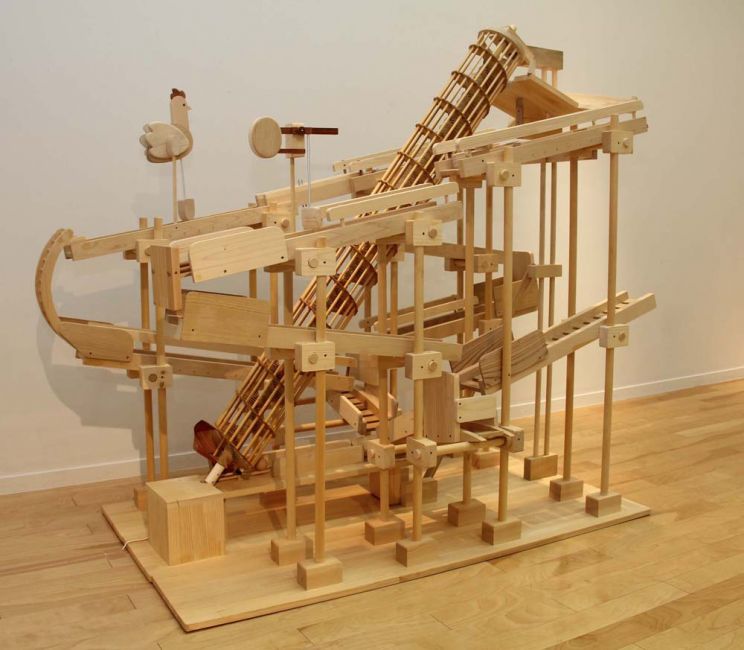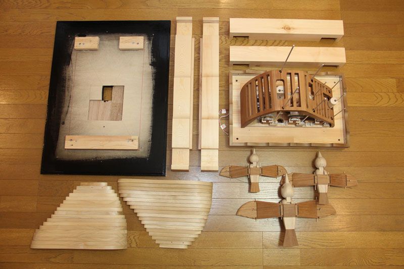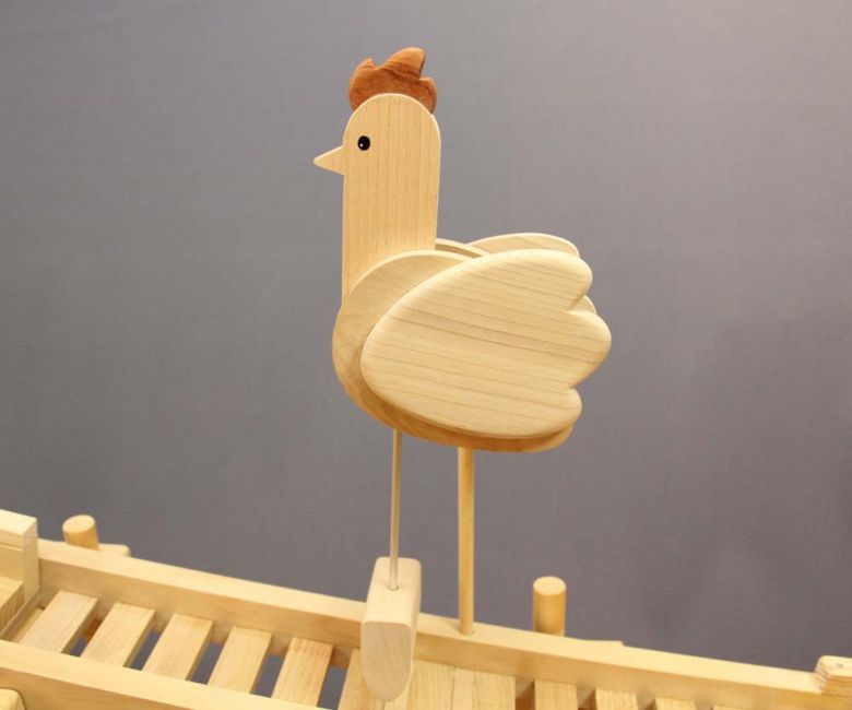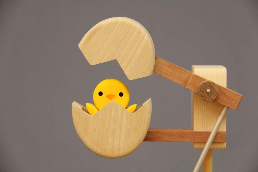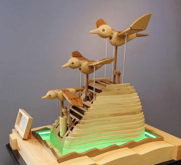 たまごループ : 木球がヒヨコや鳥を動かすからくり。モータで「らせん」が回転すると、木球は最下部から最上部へ上がり、ルートをたどって流れていきます。2017年・酉年